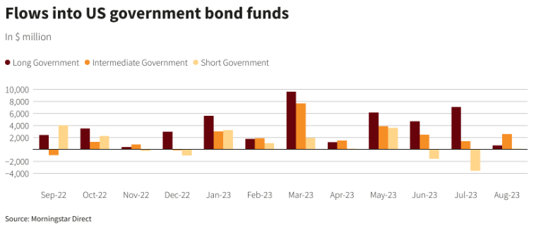 据晨星公司的数据,今年前8个月流入短期和中期美债基金(1年期~6年期)的规模为293亿美元,同比增加了70.3%。另一方面,投资于6年期以上的债券的美债基金的资金流入则降至369亿美元,同比下滑11.5%。