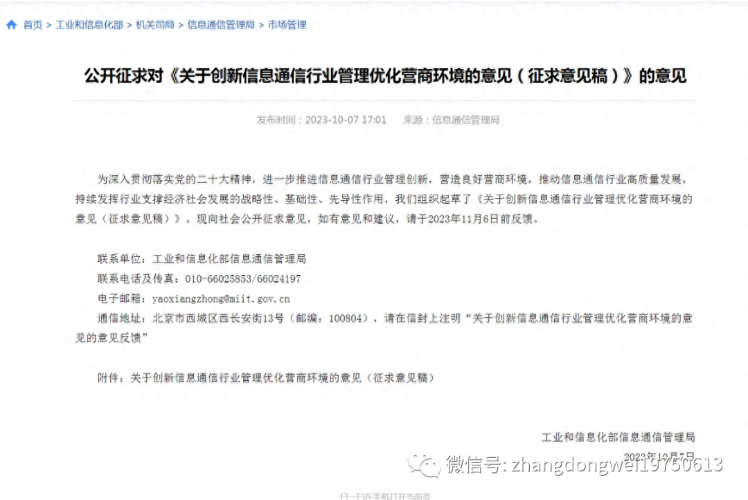 就在今天,2023年10月7日,工信部公开征求对《关于创新信息通信行业管理优化营商环境的意见(征求意见稿)》的意见。