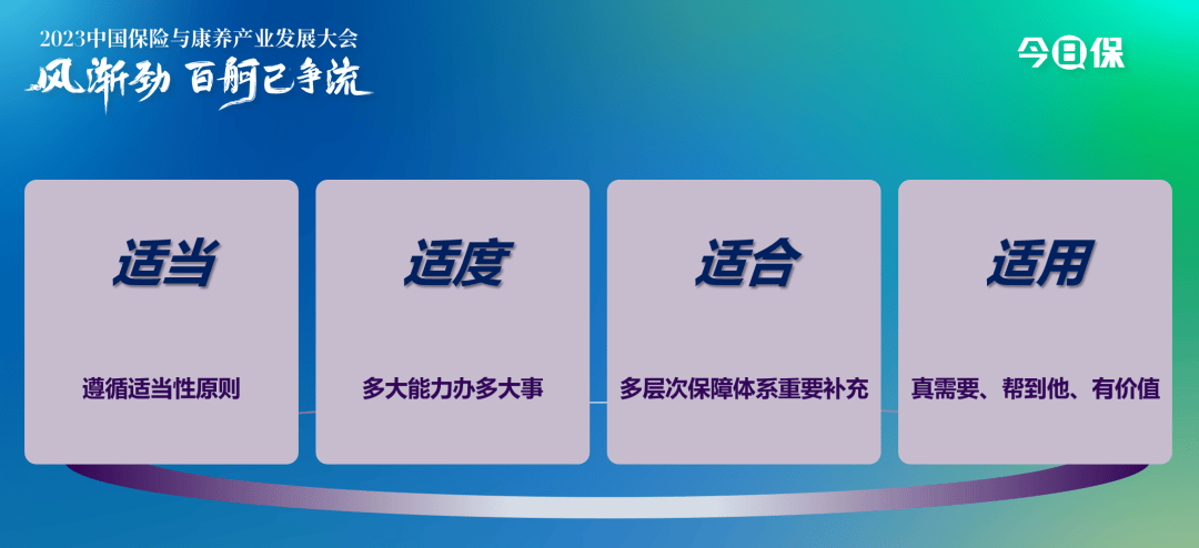 第三个“看”,从保险监管与客户体验看。其中有四个“适”。“适当”,遵循适当性原则。“适度”,多大能力办多大事。“适合”,多层次保障体系重要补充。“适用”,产品与服务做到“真需要、帮到他、有价值”。