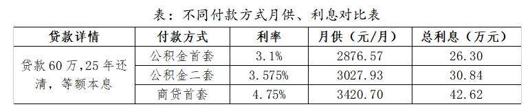 以贷款60万、25年还清(等额本息)为例做一个付款方式的横向对比:目前公积金个人住房贷款首套贷款利率为3.1%,相应的月供为2876.57元/月,利息总额为26.3万元;公积金二套贷款利率为3.575%,月供为3027.93元/月,利息总额为30.84万元;个人住房商业性贷款首套利率为4.75%(lpr 55个基点),相应的月供为3420.7元/月,利息总额为42.62万元。新标准施行后,从商贷首套转换为公积金首套每月可节省544元,总利息可节省16.32万元,从公积金二套转换为首套每月可节省151元,总利息可节省4.54万元。