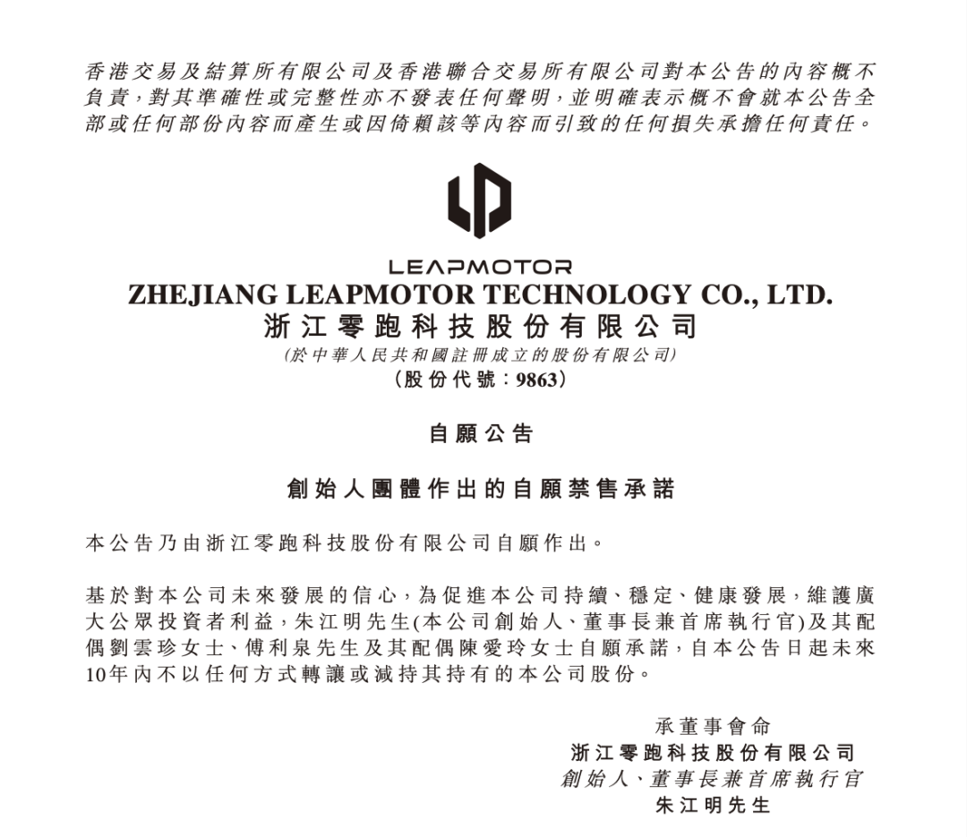 零跑汽车11月1日在港交所公告称,公司创始人承诺10年内不转让或减持其持有的股份。