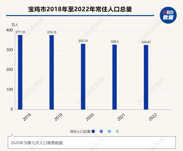 将时间线拉长来看,2018年、2019年,宝鸡常住人口分别为377.10万人、376.10万人,虽然稍有下降,但趋势并不是很明显。但2020年第七次人口普查数据显示,宝鸡市常住人口却仅有332.19万人,出现“断崖式下降”。