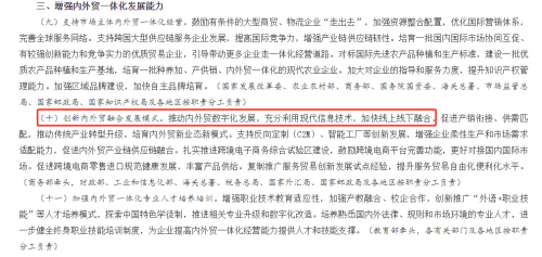 国务院办公厅在《关于促进内外贸一体化发展的意见》中提到:要创新内外贸融合发展模式,推动内外贸数字化发展,充分利用现代信息技术,加快线上线下融合,培育内外贸新业态新模式。今年以来,各地更是先后印发了一系列措施和方案,扎实推进内外贸一体化工作。