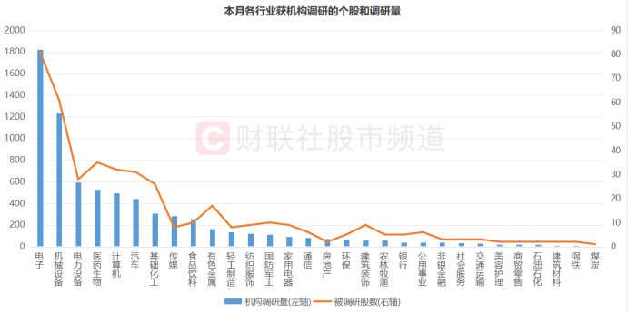 注:本月各行业获机构调研的个股和调研量(截至11月9日发稿时数据)
