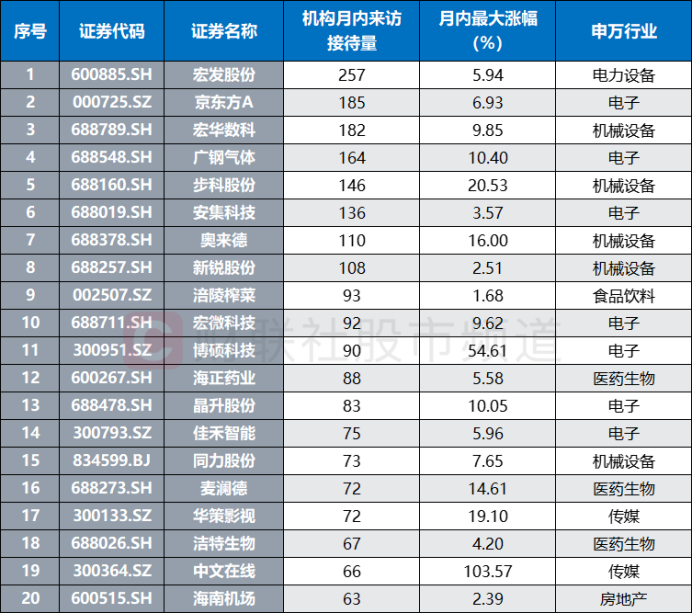 一般来说,机构投资者因其专业性和资金实力常被视作市场重要参与方,其密集调研的方向也成为普通投资者重点关注的对象。截至今日发稿时,本月以来,已有420股获机构调研,其中,29只个股月内机构调研量超50家。具体个股来看,宏发股份以257家的调研量暂居首位,京东方a、宏华数科、广钢气体、步科股份、安集科技、奥来德、新锐股份等股的调研量也居前。