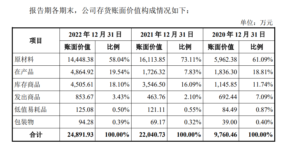 2020年至2022年,东方科脉的存货账面价值分别为9760.46万元、2.20亿元和 2.49亿元,占流动资产的比例分别为26.81%、36.07%和33.92%。同期东方科脉存货跌价损失分别为-19.89万元、-746.34万元和-2625.49万元。
