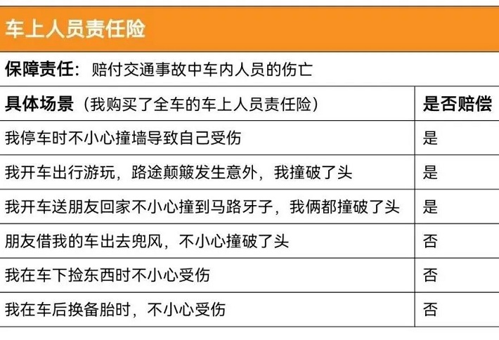 ②不在车内不赔。看名字我们就可以知道车上人员责任险针对的是“车上”,也就是说必须是在驾驶中发生意外导致的人员伤亡,如果驾乘人员不在车内是不赔的(如遇事故跳车、下车更换轮胎等不在车内的情况)。