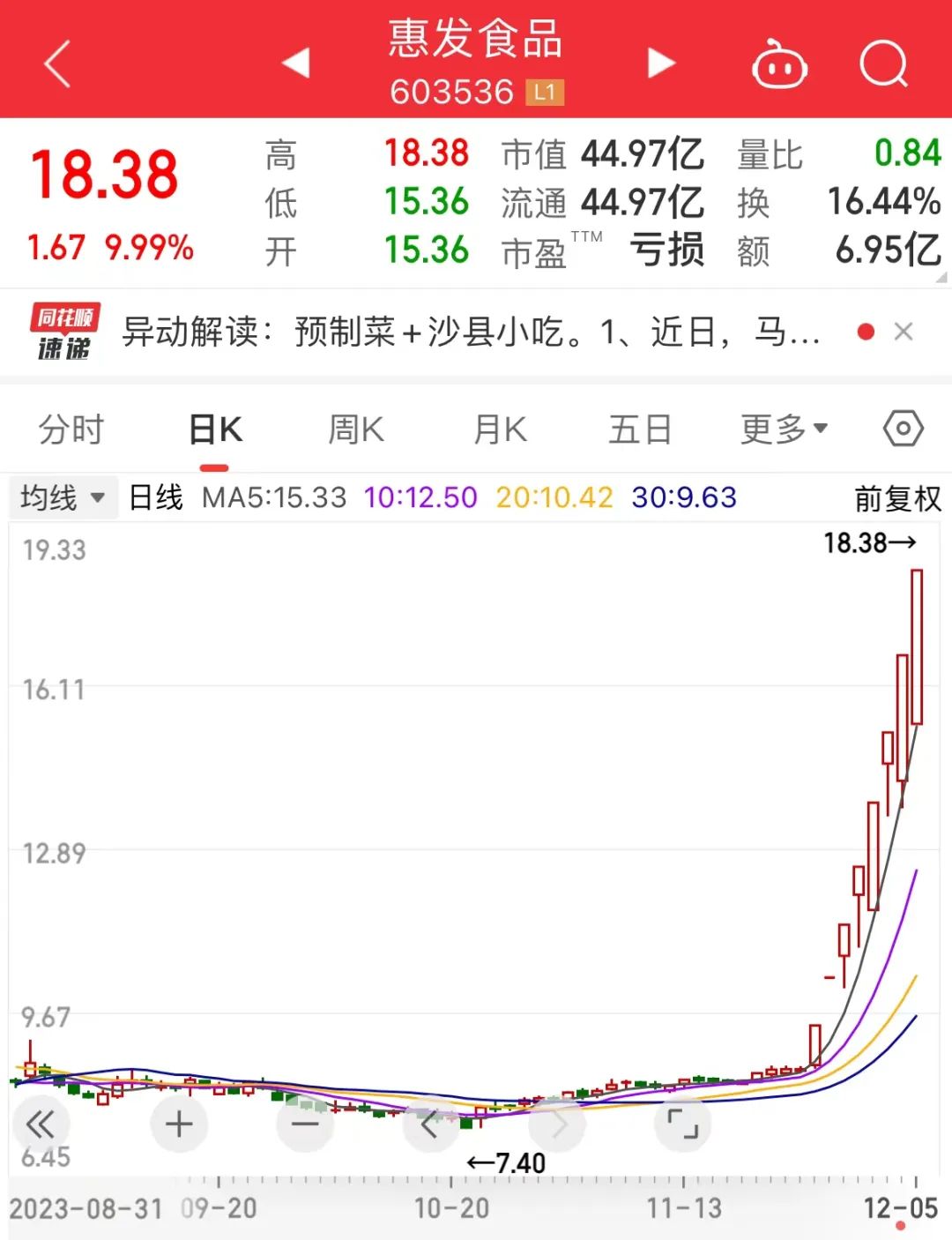 证券时报・数据宝统计,惠发食品在本次连续涨停之前,a股市值仅21亿元。该公司主要从事速冻调理肉制品的研发、生产和销售,业绩方面乏善可陈,2021年至2022年均亏损超亿元,今年前三季度亏损近0.3亿元。